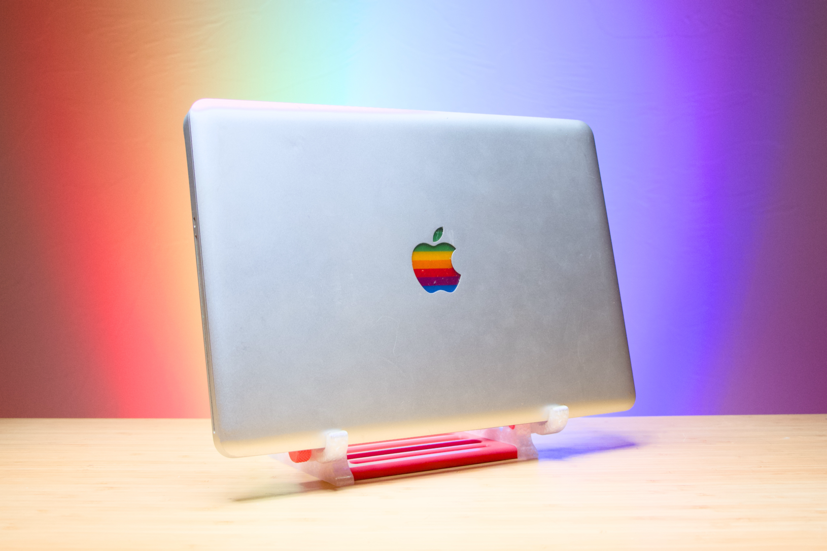 With the help of some overhead projector transparencies, this 2010 MacBook Pro now has a custom retro Apple logo.